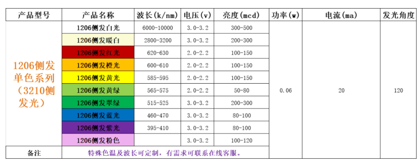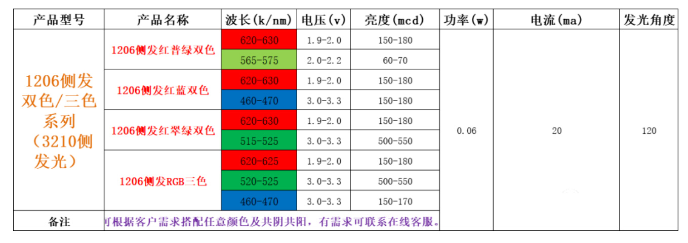 1206側發(fā)燈珠雙色、三色RGB參數(shù):